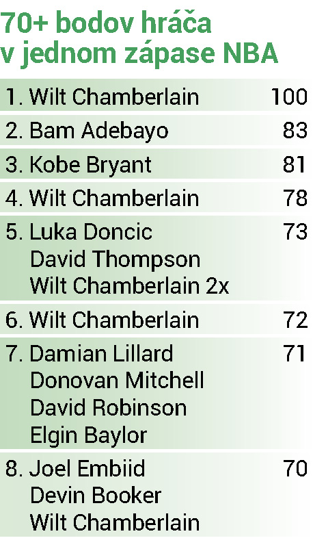 Zápas medzi Miami Heat a Washingtonom Wizards mal byť len ďalším z bohatej porcie zápasov zámorskej basketbalovej NBA. No nebol. Tento zápas sa totiž zapísal veľkými písmenami do histórie. Pivot či power forward tímu Miami Heat Bam Adebayo nastrieľal do koša Washingtonu 83 bodov, čo je druhý najvyšší počet bodov v jednom zápase v celej histórii NBA. Viac bodov má na konte len zámorská basketbalová ikona Wilt Chamberlain – rovnú stovku ešte z roku 1962.
